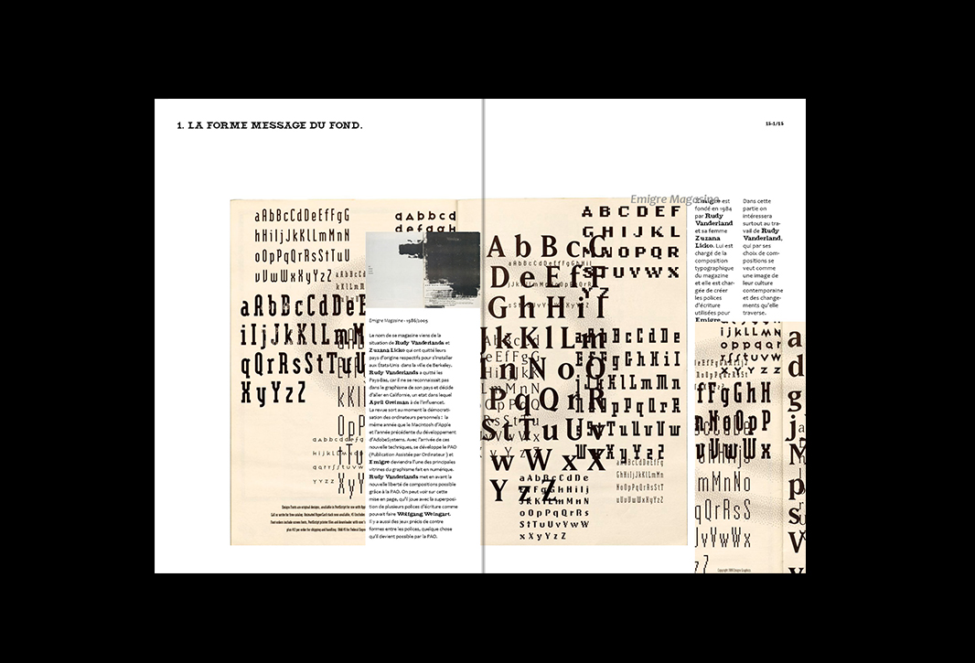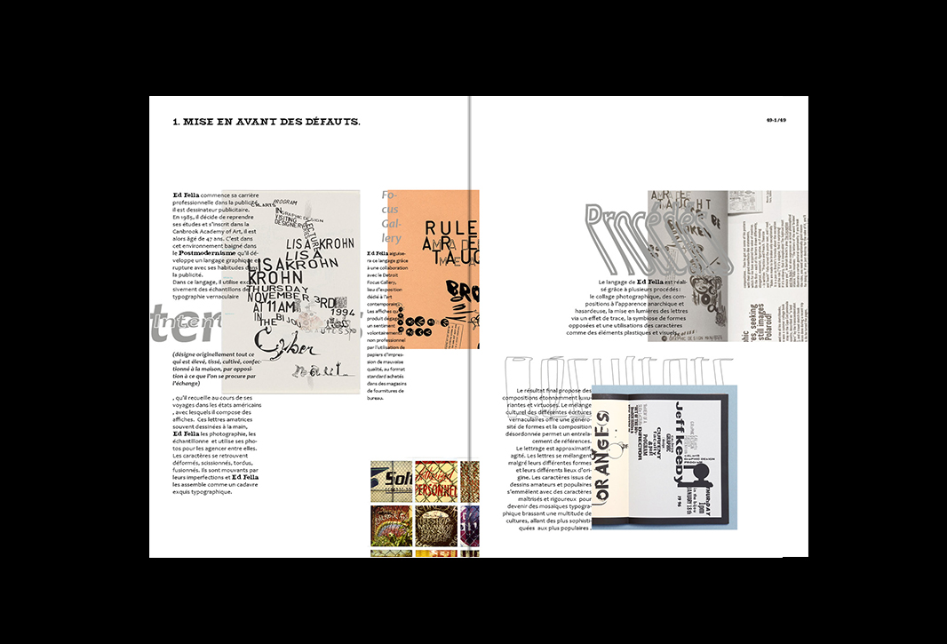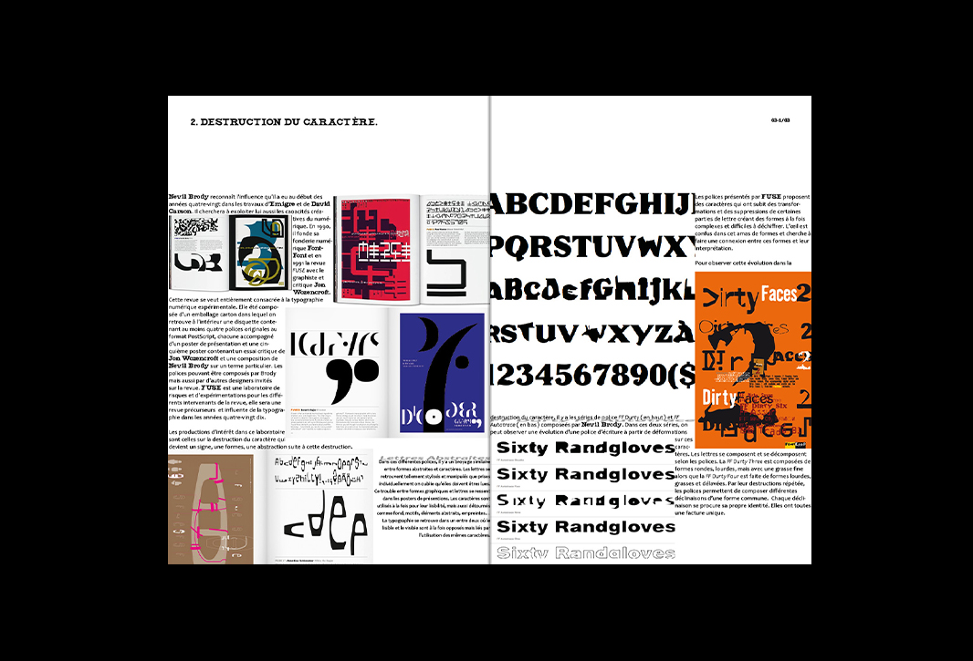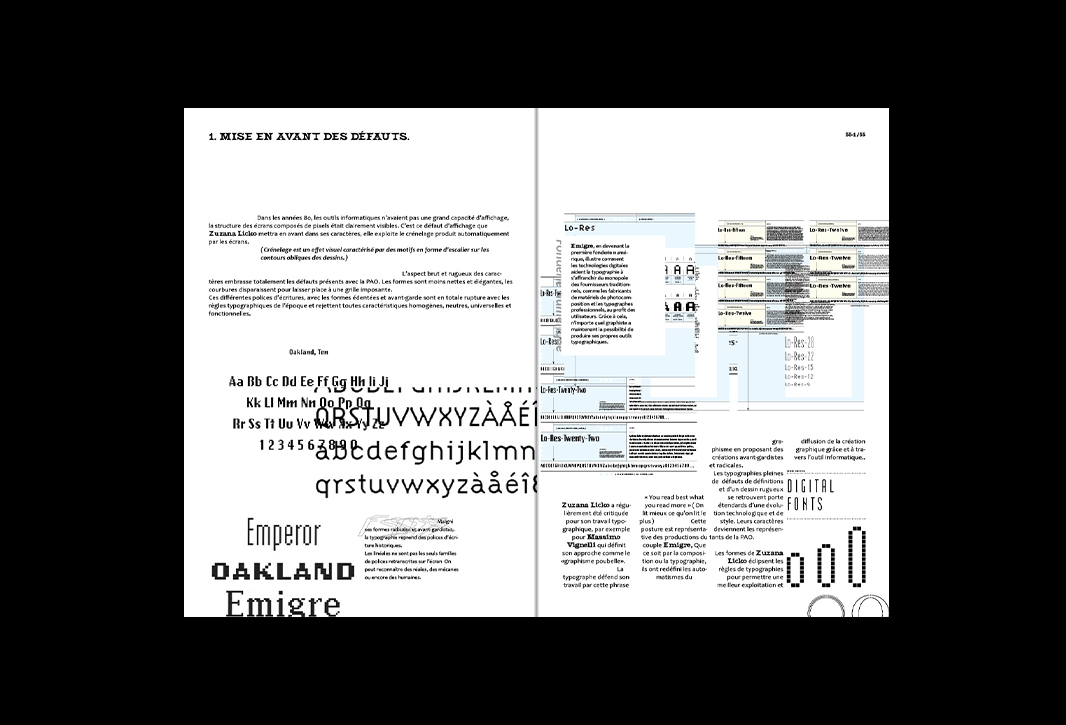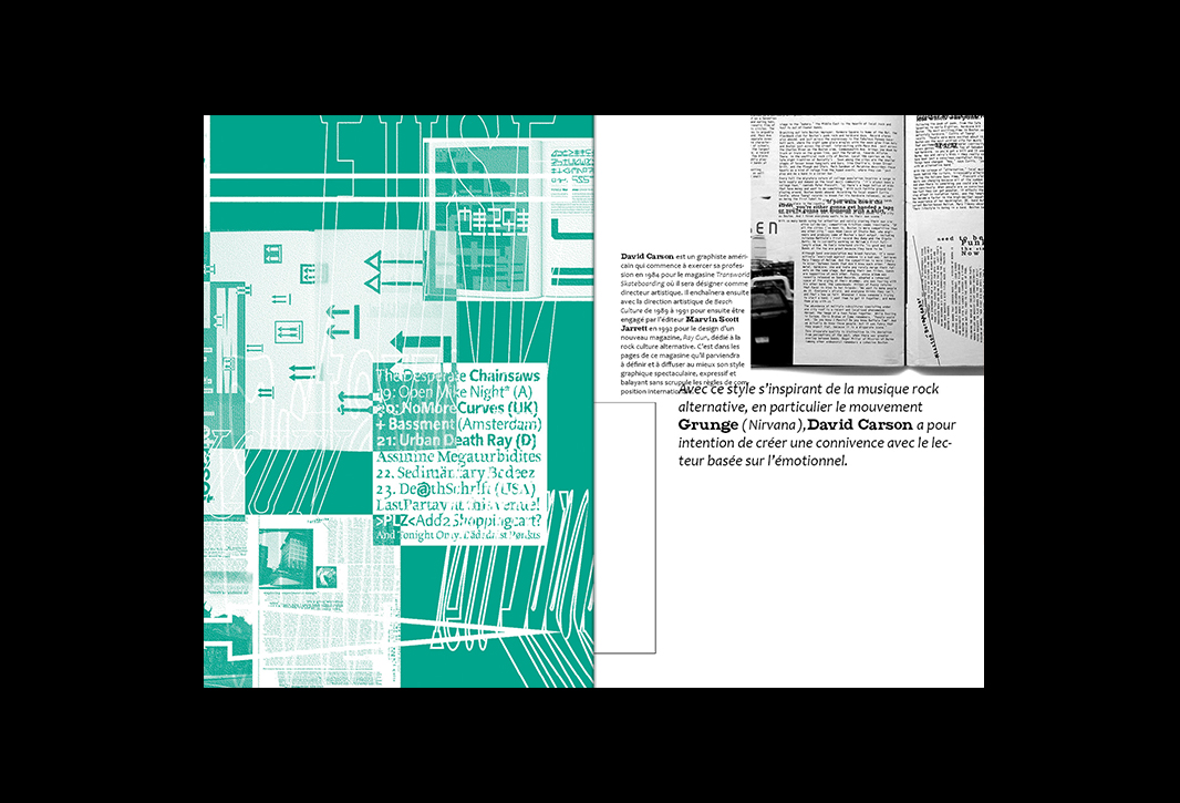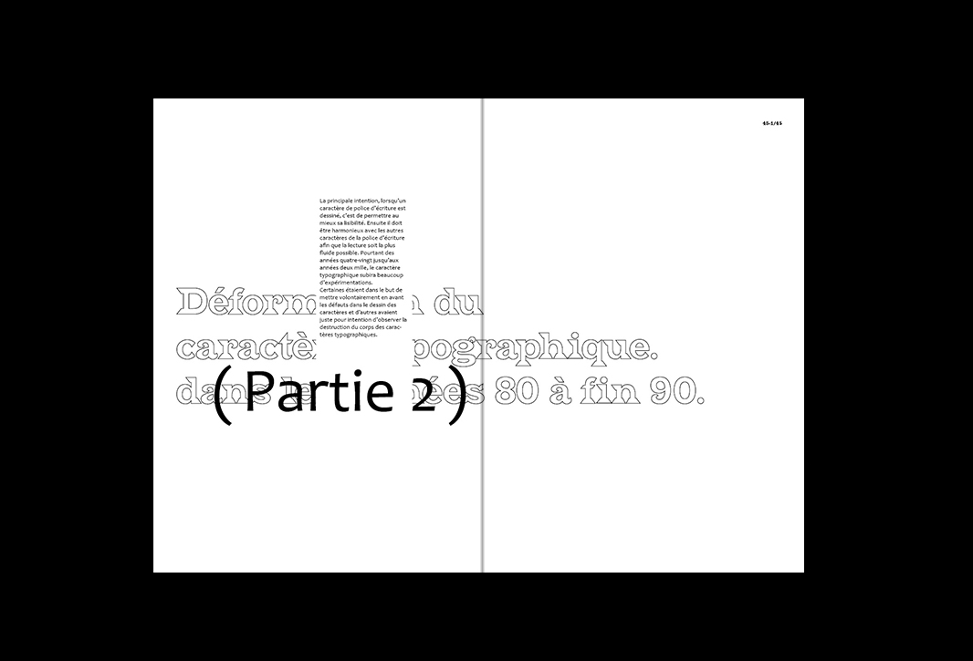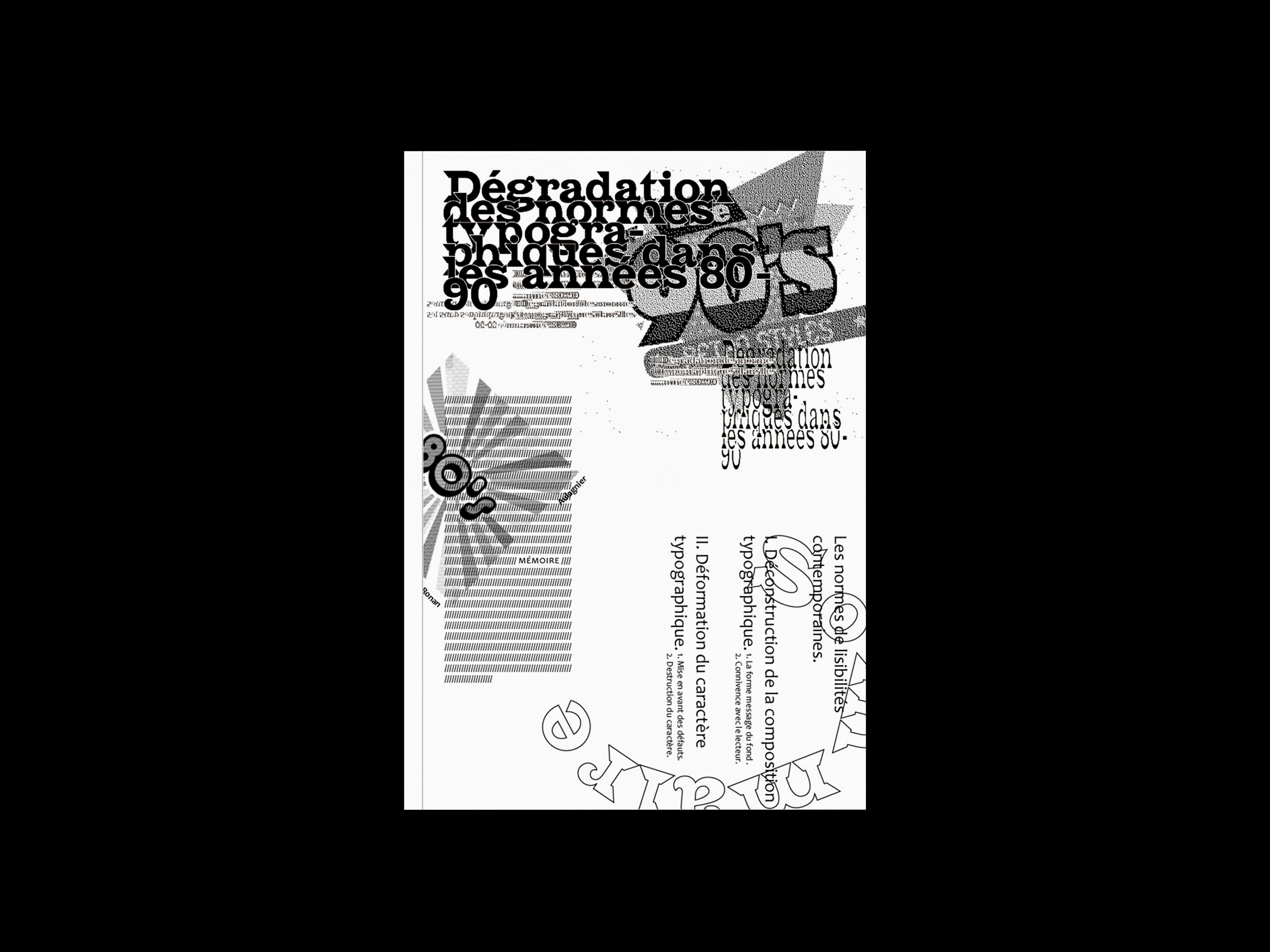 Mémoire de licence pro sur la déformation des normes typographiques dans les années 80 à 90. La mise en page du mémoire évolue selon les différents graphistes présentés.