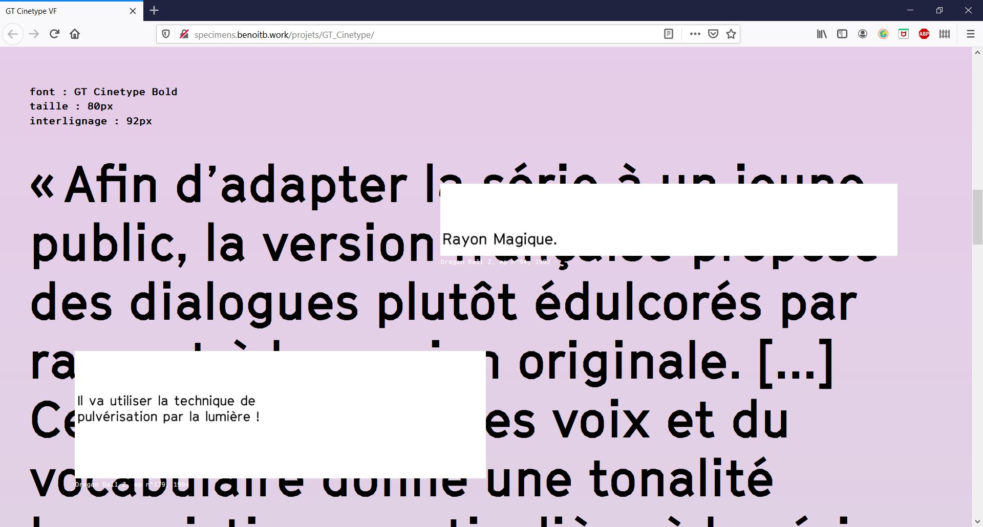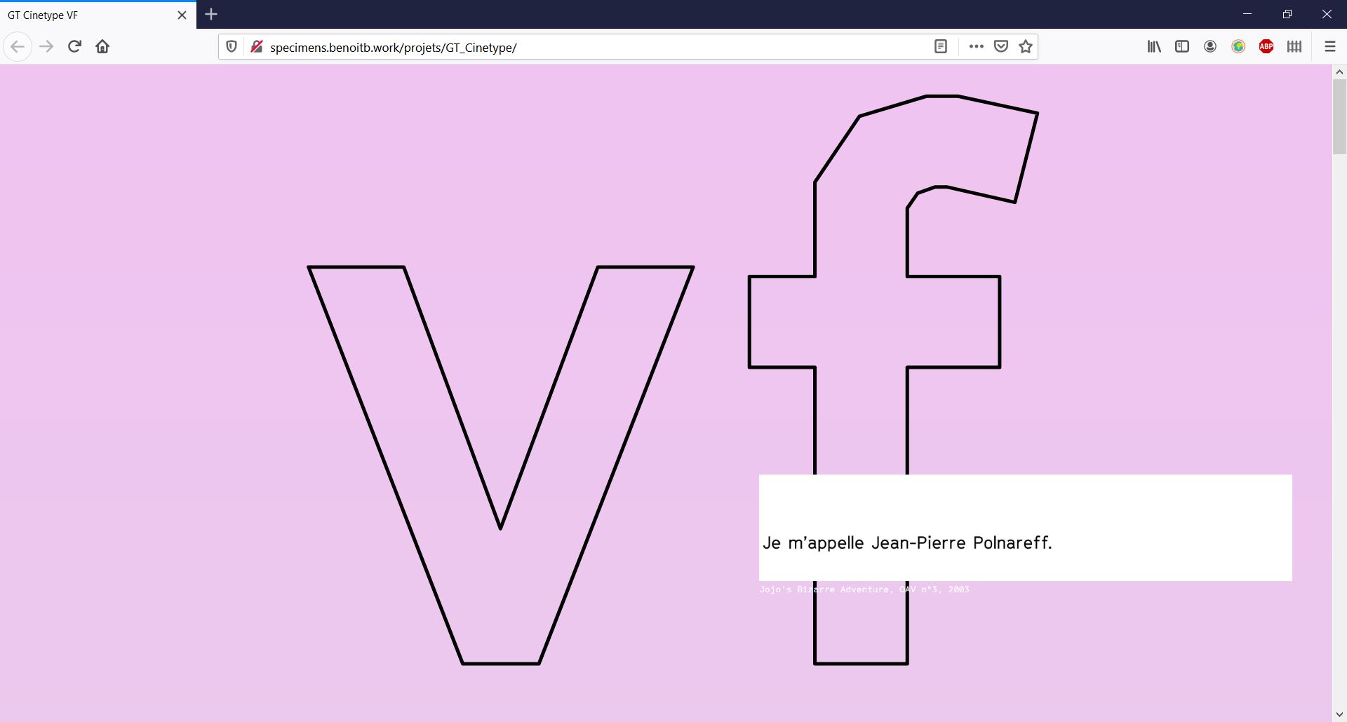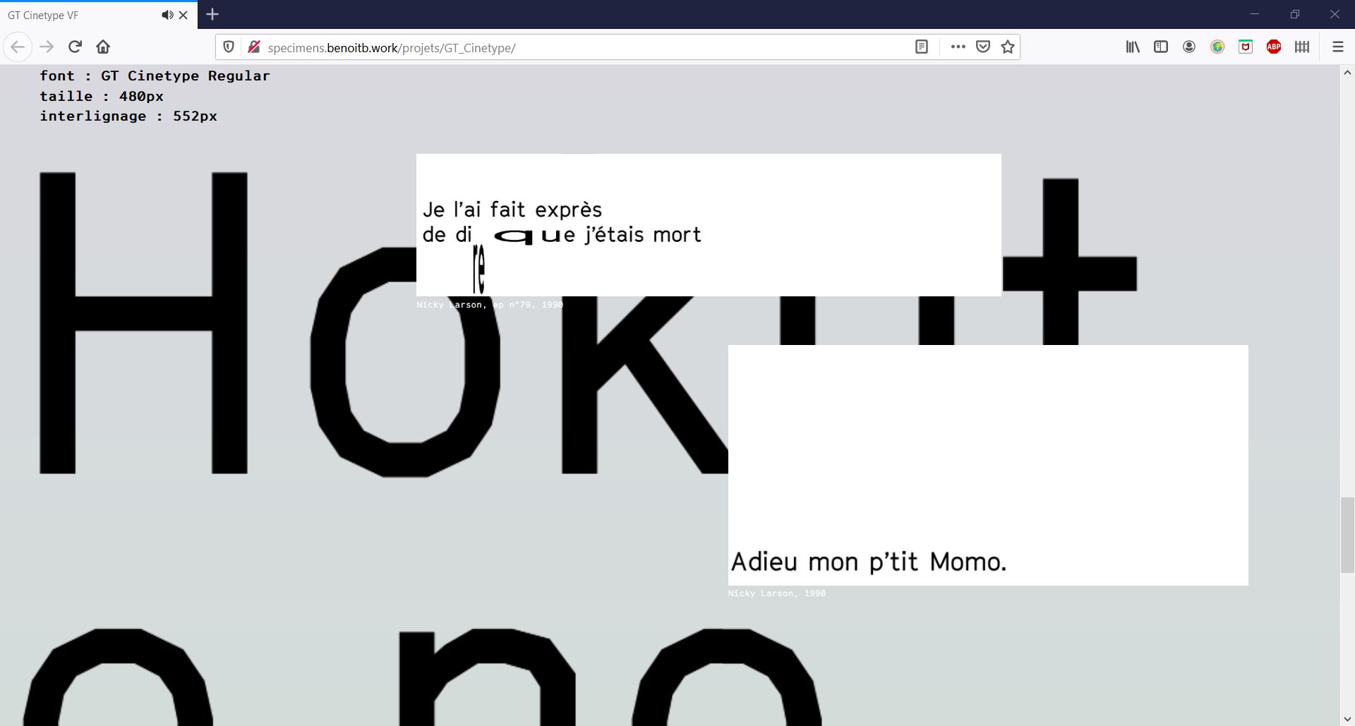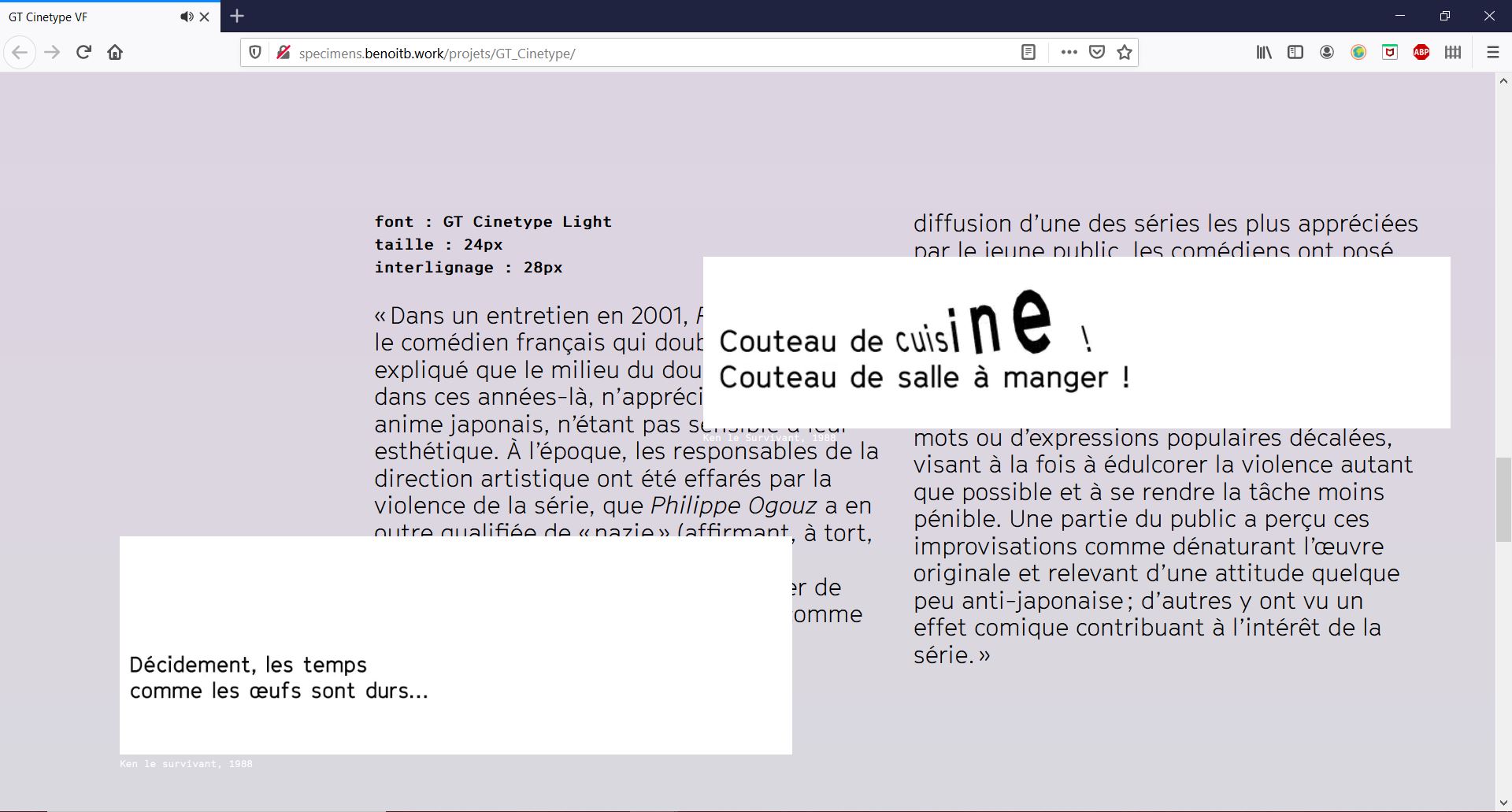 Projet de workshop avec l’intervenant Benoit Böhnke, Travail en binôme avec Lilou Garnier dont l’objectif était de créer un spécimen de typographie sur un site web. Nous avons utilisé la police « GT CineType » inspirée des sous-titres de films que nous avons mis en valeur via des citations animées.